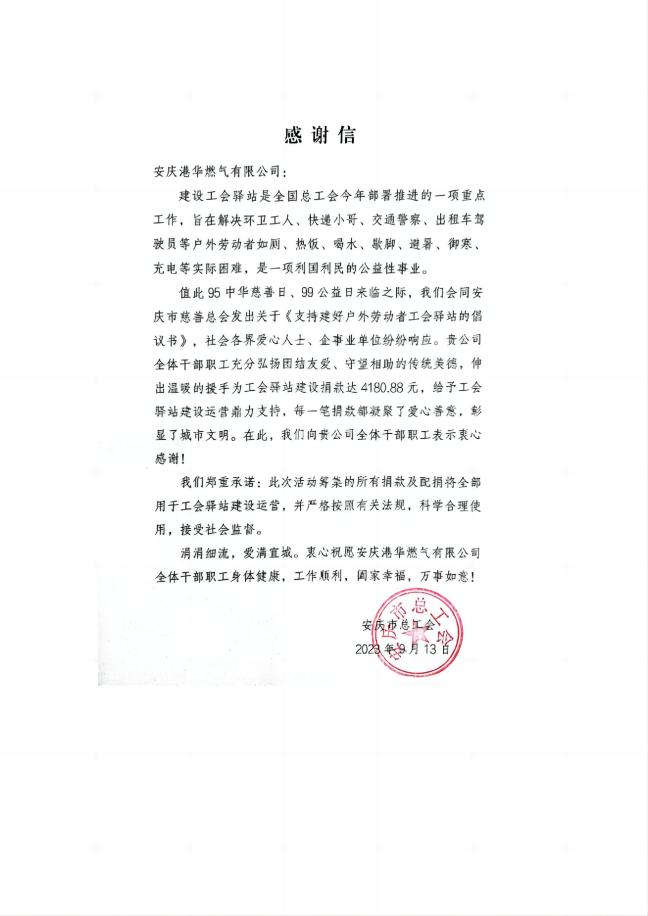 為進(jìn)一步傳播慈善文化,弘揚(yáng)傳統(tǒng)美德,推動(dòng)戶外勞動(dòng)者工會(huì)驛站建設(shè)。在全國(guó)第八個(gè)“中華慈善日”來(lái)臨之際,安慶港華高度重視,認(rèn)真部署,依法組織,在公司開(kāi)展“慈善日捐款”活動(dòng)。